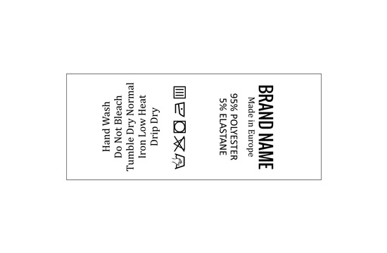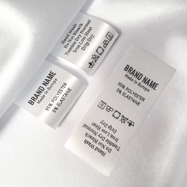 Etiqueta de cuidados de lavagem, personalizada com textos impressos digitalmente em cetim branco, adequada para qualquer produto de vestuário. Este tipo de etiqueta têxtil é feito usando as tecnologias mais avanças no campo de impressões digitais num suporte têxtil. As etiquetas são impressas num cetim especial através do método de transferência térmica, com uma qualidade de impressão impressionante e alta resistência à lavagem.