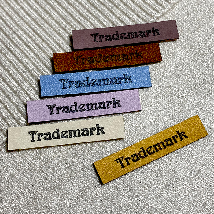 Etiqueta personalizada EP-M125 produzida em couro sintético para vestuário, malas, sapatos e vários acessórios de vestuário.