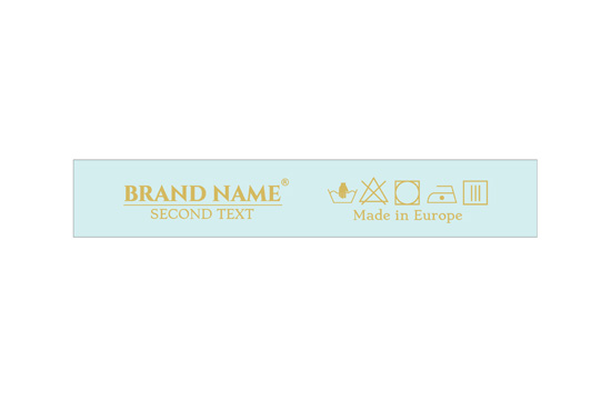 Etiqueta de cuidados de lavagem personalizada com símbolos de lavagem e o nome da Marca ou logo, adequada para qualquer produto têxtil, especialmente artigos de vestuário. Este tipo de etiqueta têxtil é feito usando as tecnologias mais avanças no campo de impressões digitais num suporte têxtil. As etiquetas são impressas num cetim especial através do método de transferência térmica, com uma qualidade de impressão impressionante e alta resistência à lavagem.