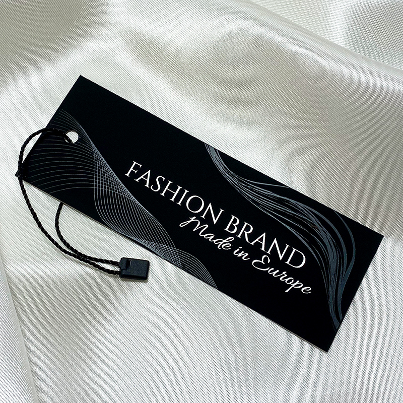 Etiqueta para roupa em cartão, com cordão com selo, personalizada com textos diversos e o logotipo do fabricante. Este tipo de etiqueta pendurada é feita de materiais de alta qualidade, usando as tecnologias mais avançadas no campo de impressão e acabamento Digital.