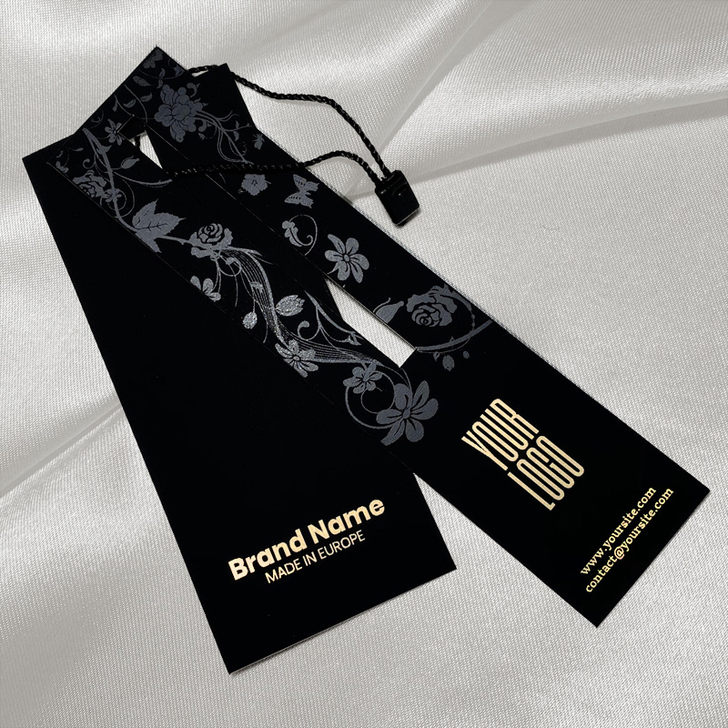 Conjunto elegante de etiquetas para pendurar com selo de plástico preto incluído feito de materiais de alta qualidade de vários têxteis tas como roupa de mulher, vestidos, roupa de homem, calças, casacos, etc. Este tipo de etiqueta pendurada é feita de materiais de alta qualidade, usando as tecnologias mais avançadas no campo de impressão e acabamento Digital.