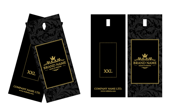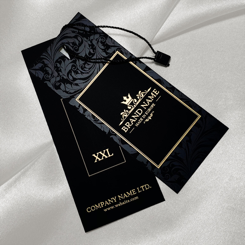 Etiquetas de vestuário com um design Premium e selo com um fio preto incluído, feito de cartão laminado Soft Touch e personalizado com alumínio dourado. Este tipo de etiqueta pendurada é feita de materiais de alta qualidade, usando as tecnologias mais avançadas no campo de impressão e acabamento Digital.
