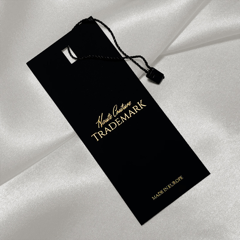 Etiqueta preta com escrita dourada feita de cartão laminado grosso Soft Touch, com lacro de plástico com fio incluído, adequada para vários produtos de vestuário. Este tipo de etiqueta pendurada é feita de materiais de alta qualidade, usando as tecnologias mais avançadas no campo de impressão e acabamento Digital.