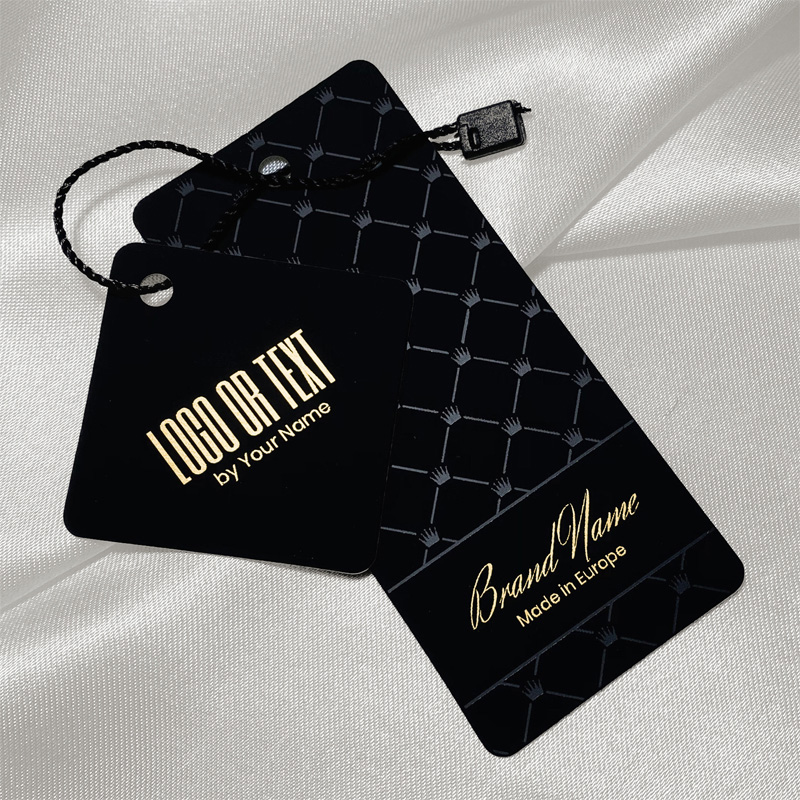 Etiquetas de roupa de qualidade premium, fornecidas com selo de plástico com fio preto, feitas de cartão laminado Soft Touch e personalizadas com alumínio dourado. Este tipo de etiqueta pendurada é feita de materiais de alta qualidade, usando as tecnologias mais avançadas no campo de impressão e acabamento Digital.