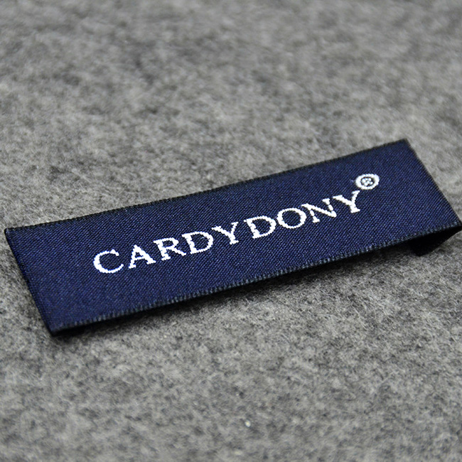 Etiqueta de produto modelo Tidy Style bordada com nomes e logo personalizado em diferentes cores, num suporte têxtil especial, adequada para vestuário e não só. Este tipo de etiqueta bordada é feito de materiais de alta qualidade, usando as tecnologias mais avançadas do campo de bordado digital a um nível industrial.