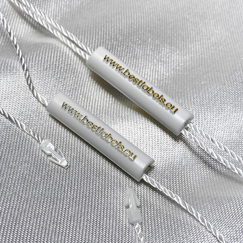 Selo de plástico ST-M239 com forma cilíndrica e um design cativante e texto personalizado em ambos os lados, adequado para vários artigos de vestuário como jeans, calças, fatos de mulher e homem e muitas outras peças de roupa, sapatos e malas. Este tipo de selo é feito de materiais de alta qualidade usando as tecnologias mais avançadas na área.